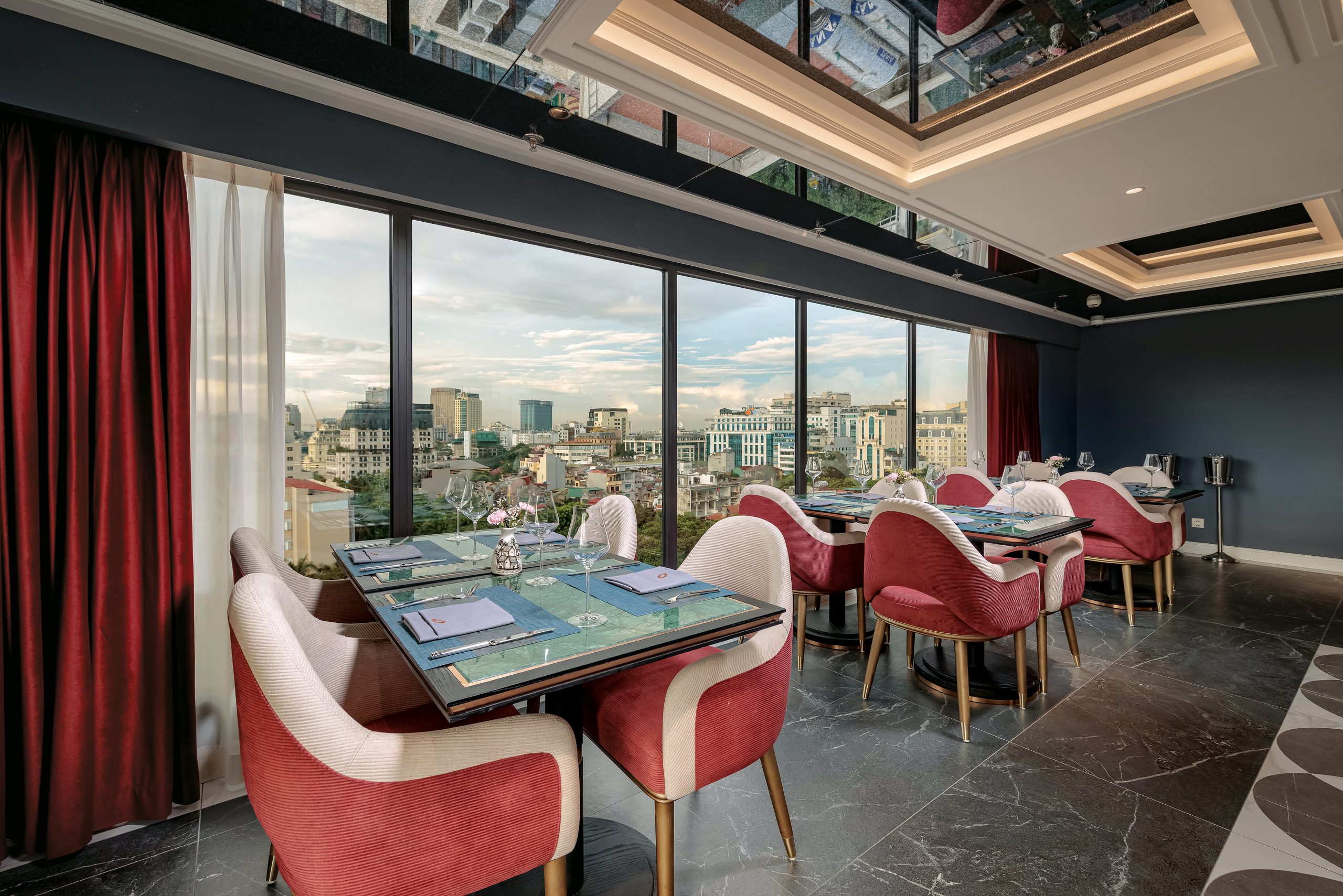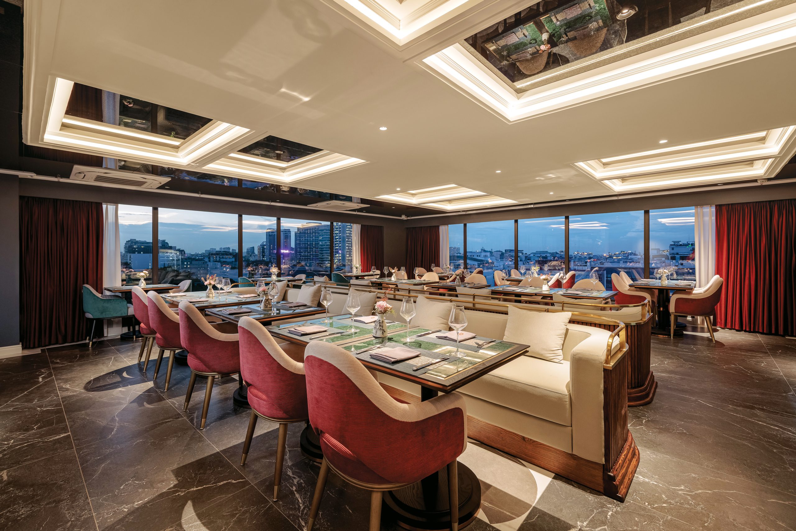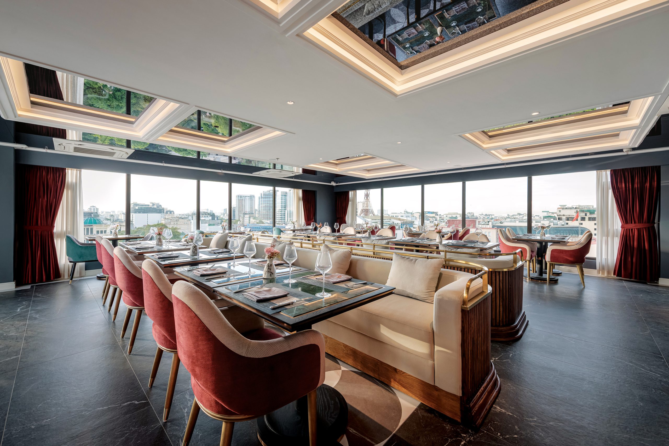 Designed in a modern luxury style, Sora features warm tones, plush upholstered seating, subtle gold accents, and floor-to-ceiling windows overlooking Hanoi’s cityscape. The atmosphere is both intimate and sophisticated—perfect for romantic dinners, business gatherings, or memorable celebrations.