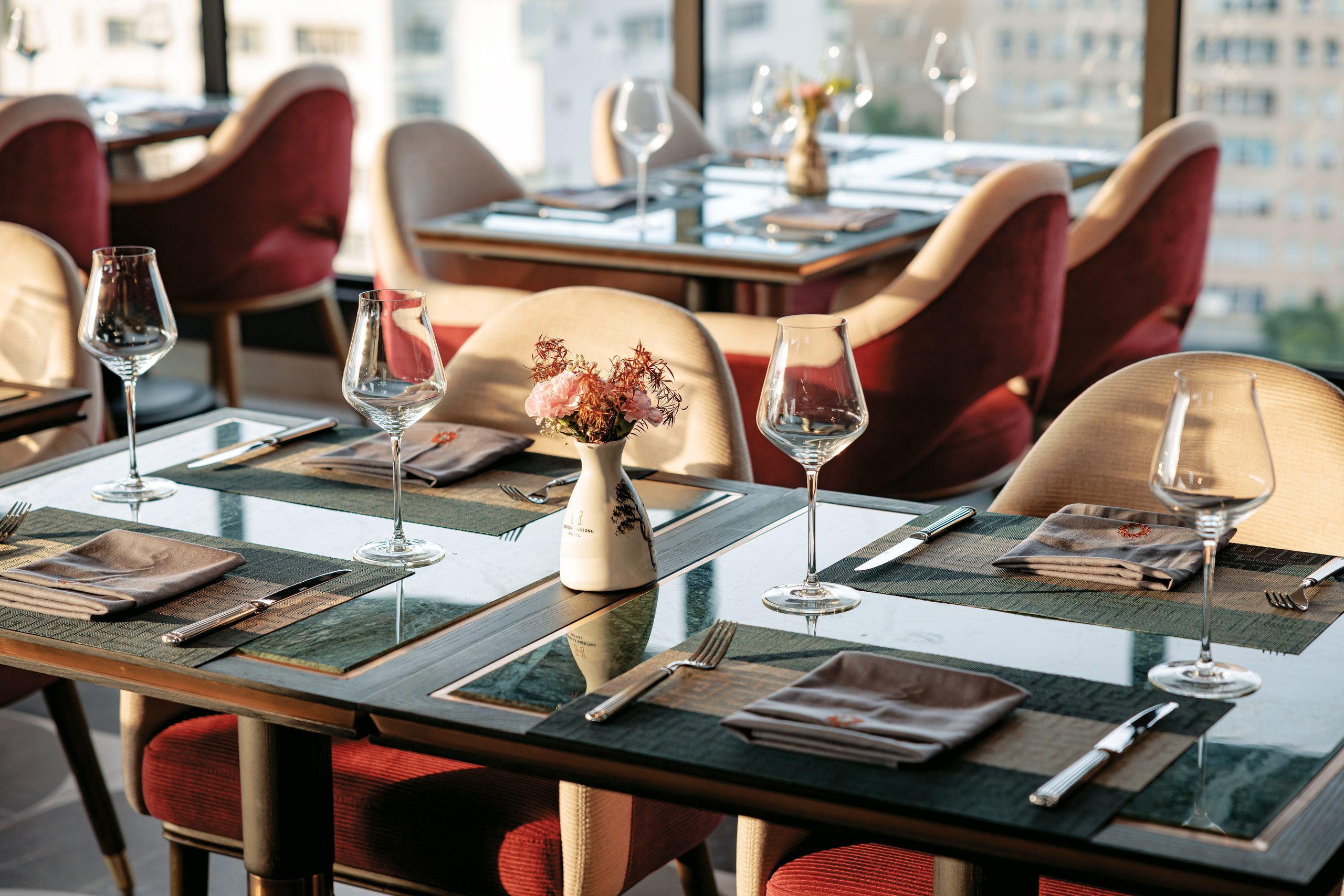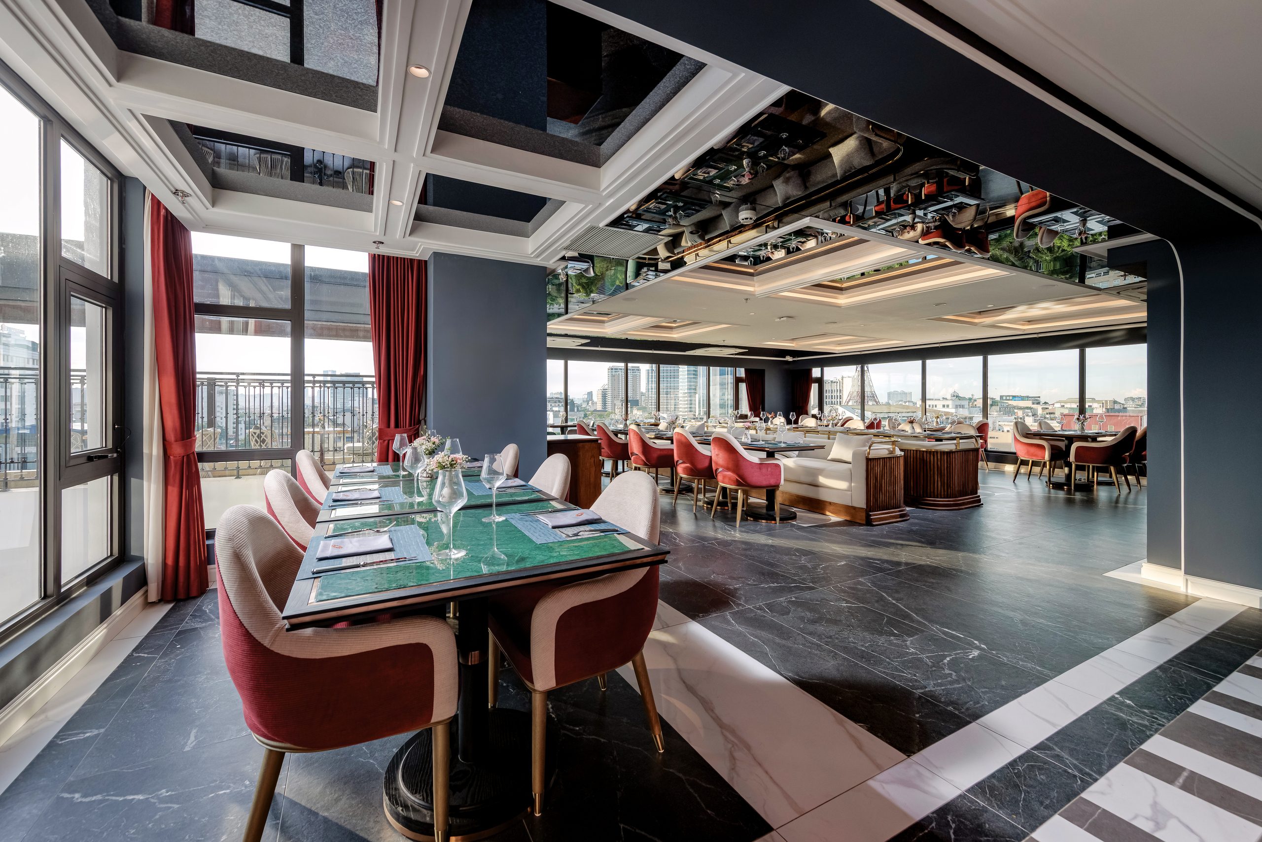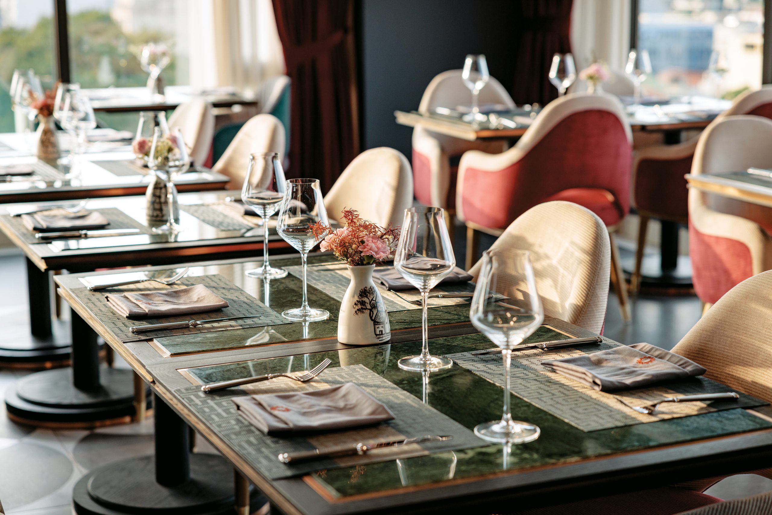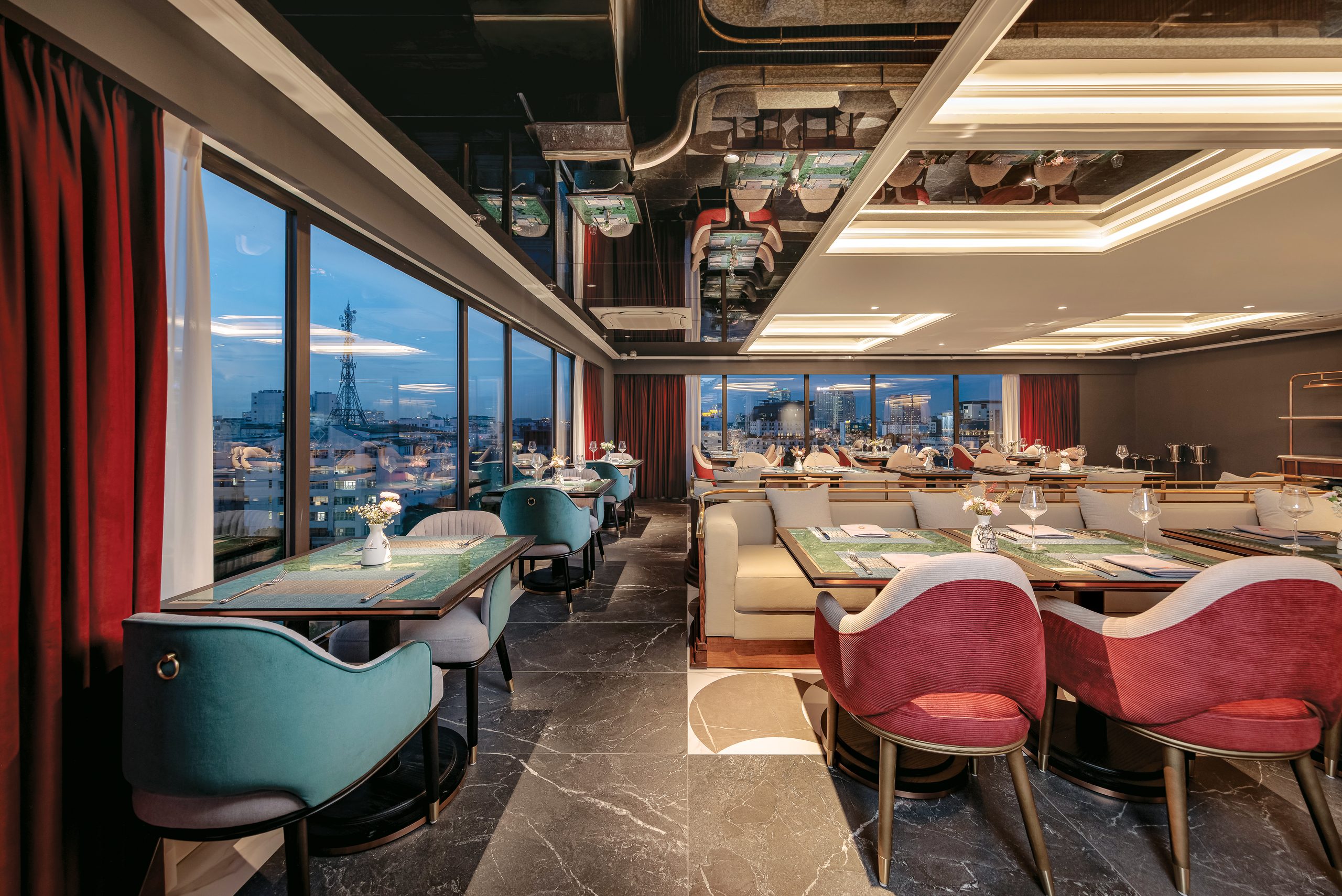 Designed in a modern luxury style, Sora features warm tones, plush upholstered seating, subtle gold accents, and floor-to-ceiling windows overlooking Hanoi’s cityscape. The atmosphere is both intimate and sophisticated—perfect for romantic dinners, business gatherings, or memorable celebrations.